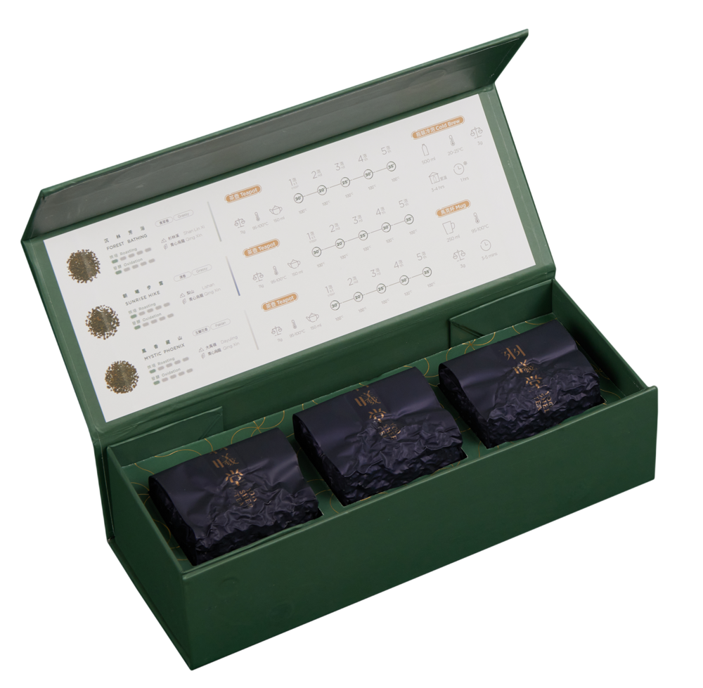 台灣山岳茶組帶你遨遊台灣百岳的霸氣及不凡高度。三款高山茶品包含「沉林芳浴」、「朝曦步雲」及「鳳香藏山」,適合有著不凡品味的茶友。