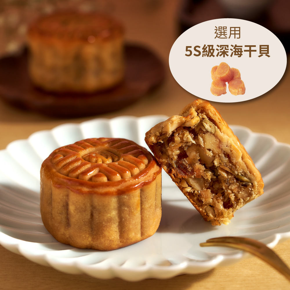 選用5S級深海干貝,長時間浸泡並手工拔絲後,經過高溫快火爆炒後,深海的極致鮮味巧妙地融入月餅內餡,與堅果完美結合。